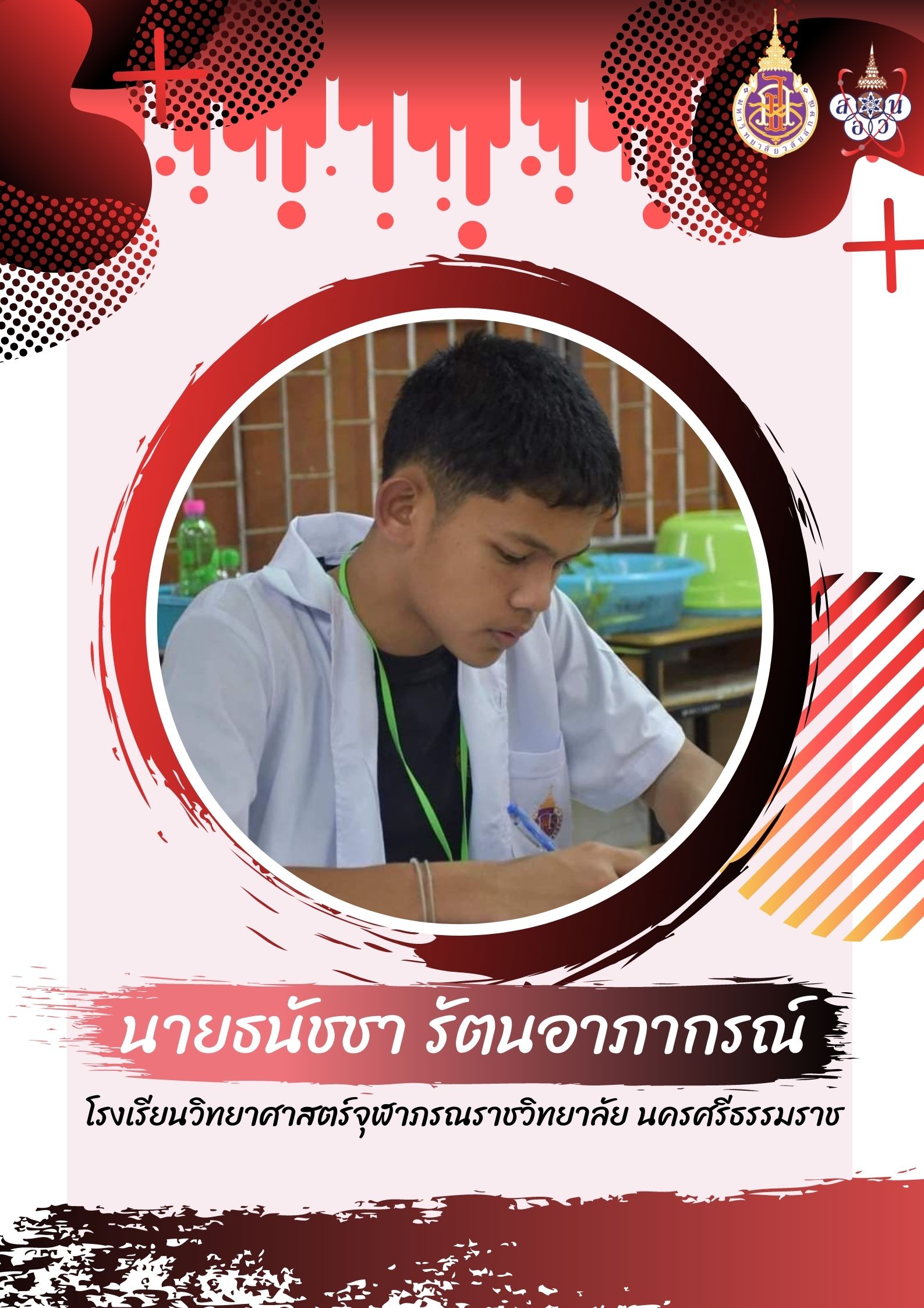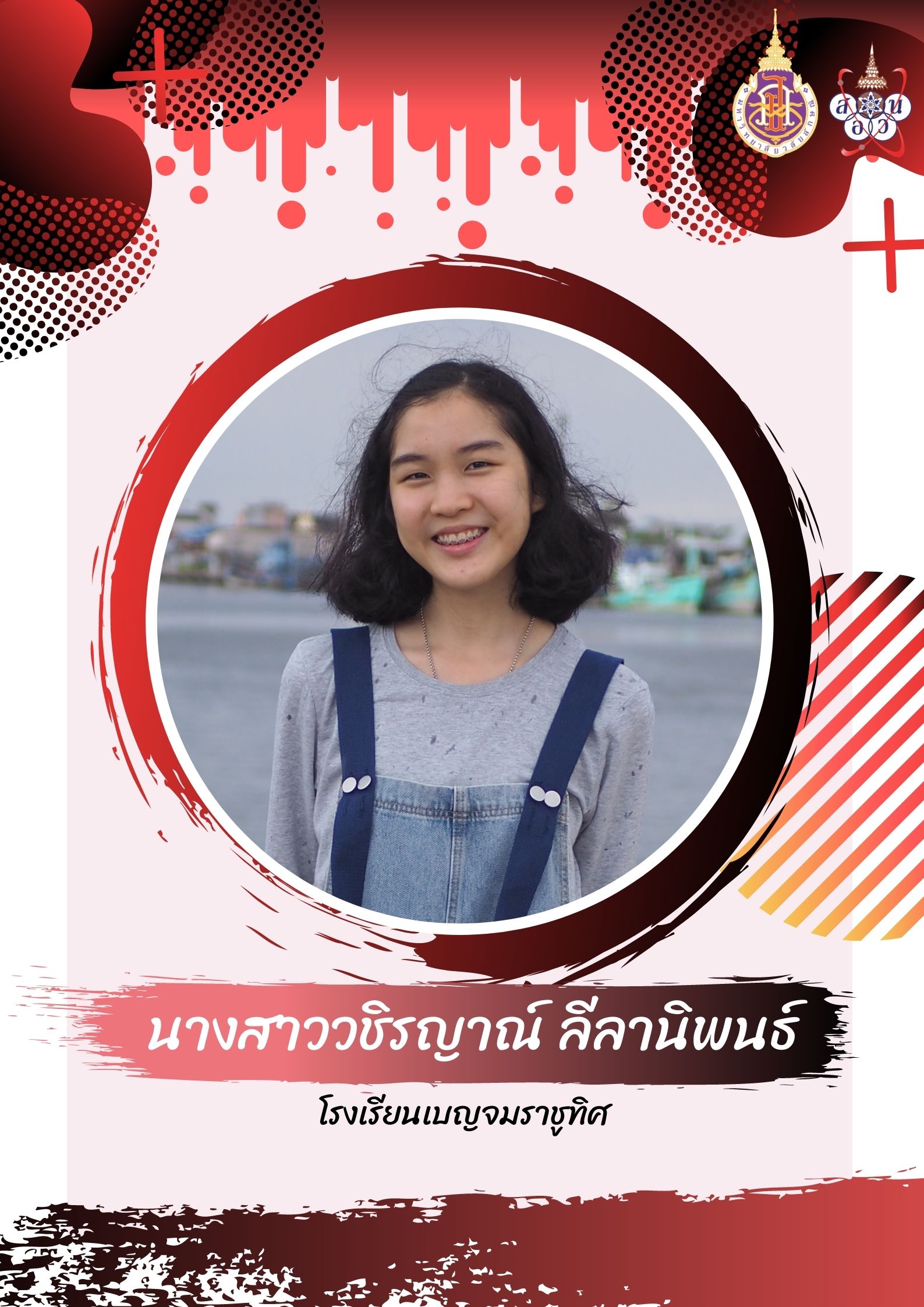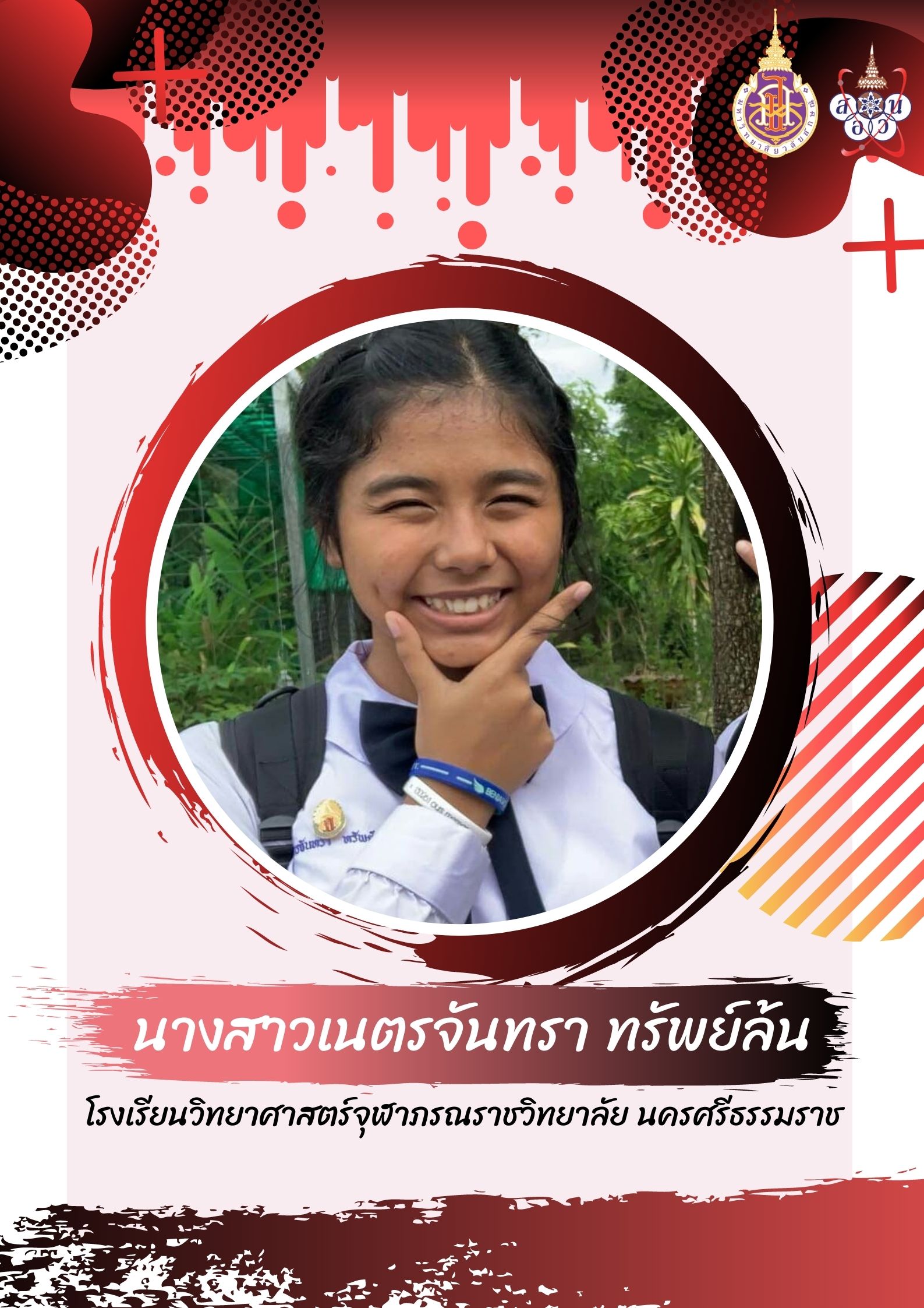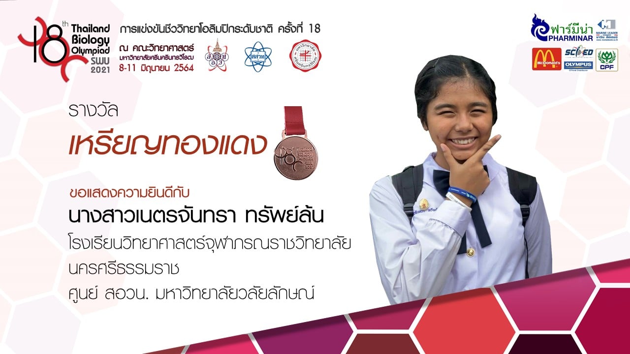 3. รางวัลเหรียญทองแดง ได้แก่ นางสาวเนตรจันทรา ทรัพย์ล้น นักเรียนโรงเรียนวิทยาศาสตร์จุฬาภรณราชวิทยาลัย นครศรีธรรมราช