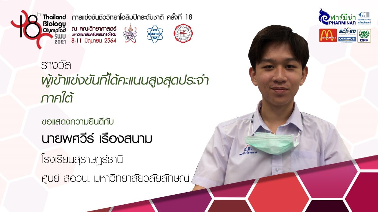 1. รางวัลคะแนนรวมสูงสุดระดับภูมิภาคภาคใต้ ได้แก่ นายพศวีร์ เรืองสนาม นักเรียนโรงเรียนสุราษฎร์ธานี