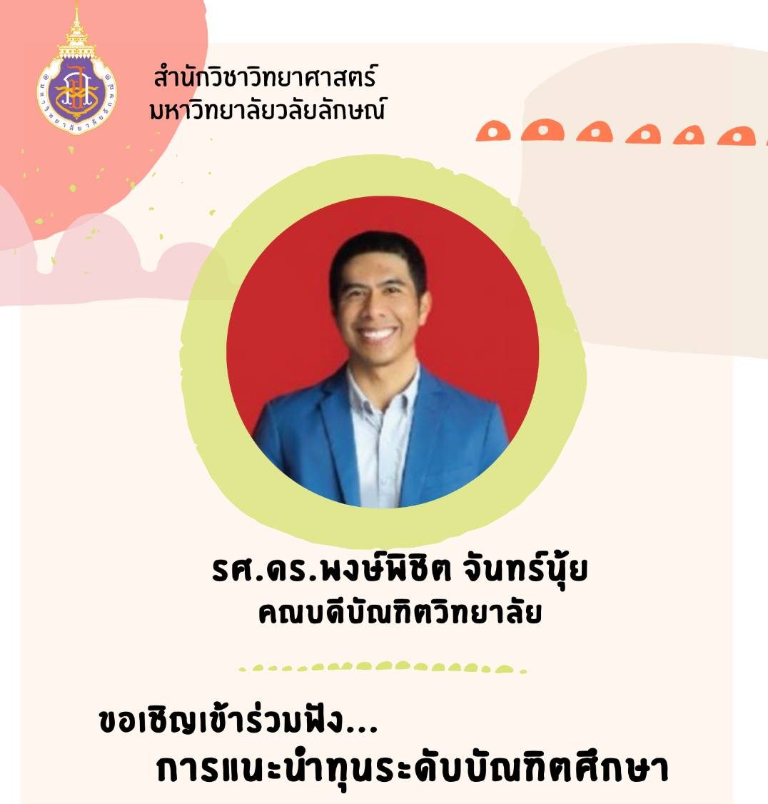 สำนักวิชาวิทยาศาสตร์ กำหนดจัดกิจกรรม “แนะนำทุนระดับบัณฑิตศึกษา” ขึ้น ในวันพุธที่ 15 ธันวาคม 2564 เวลา 10.00-12.00 น. (ผ่าน Zoom Meeting) โดยได้เรียนเชิญ รองศาสตราจารย์ ดร.พงษ์พิชิต จันทร์นุ้ย คณบดีบัณฑิตวิทยาลัย มาเป็นวิทยากรให้ความรู้ความเข้าใจในเรื่องทุนบัณฑิตศึกษาดังกล่าว ทั้งนี้ เพื่อเป็นการเตรียมความพร้อมในการรับนักศึกษาระดับบัณฑิตศึกษาของหลักสูตร และเพื่อทำความเข้าใจเกี่ยวกับเรื่องทุนการศึกษาในระดับบัณฑิตศึกษา รวมทั้งสามารถแลกเปลี่ยนเรียนรู้และซักถามในประเด็นที่เกี่ยวข้องได้โดยตรงกับบัณฑิตวิทยาลัย