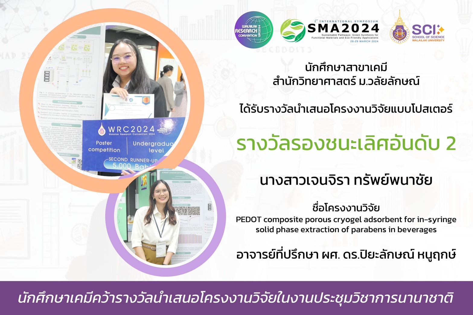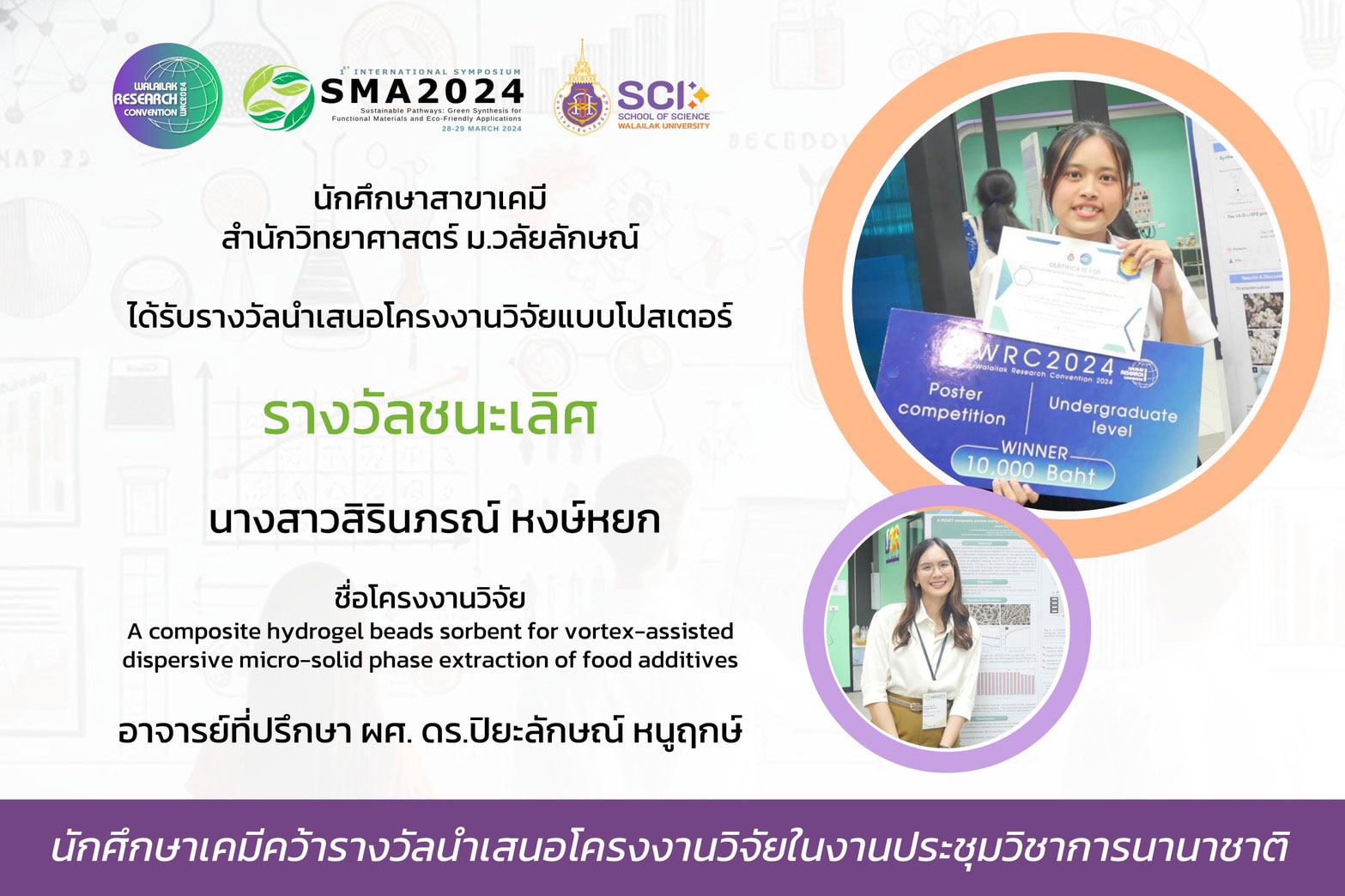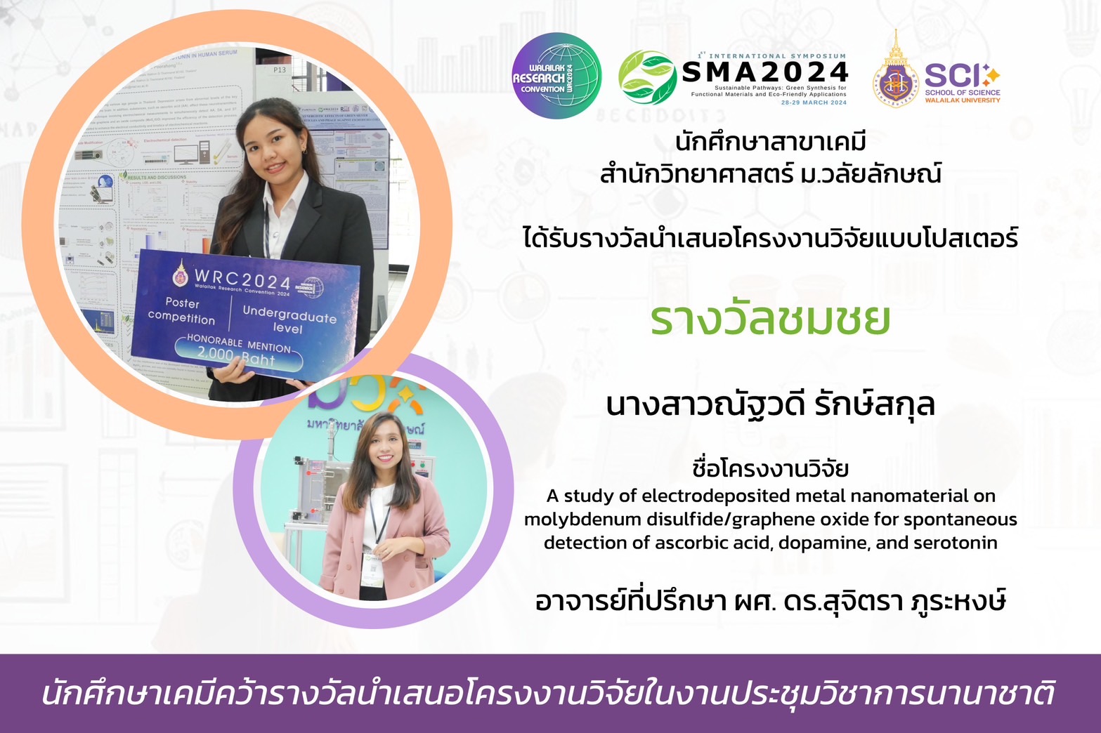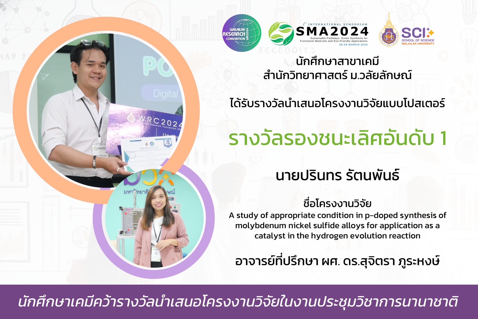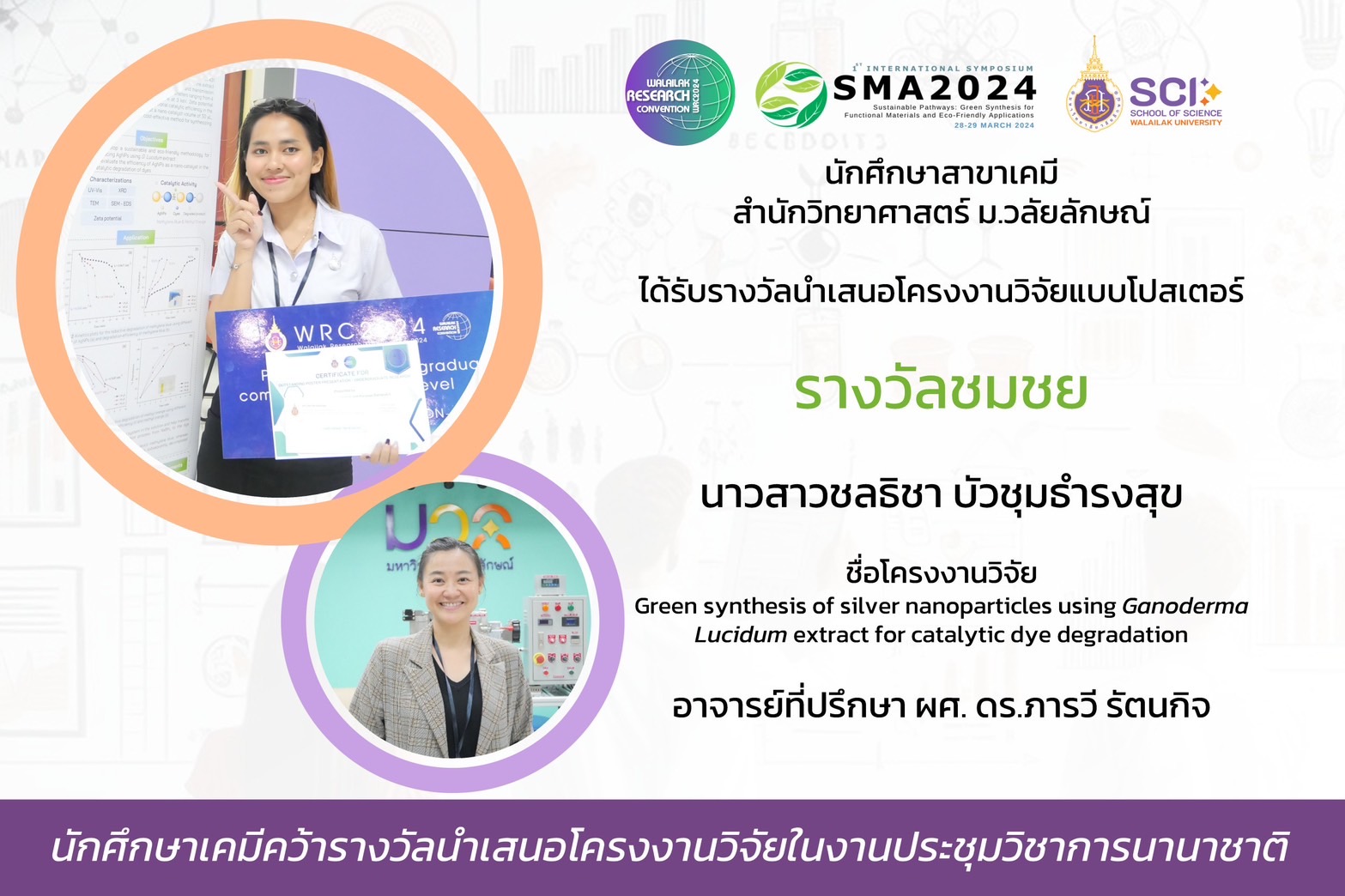 ในงานประชุมนานาชาติ International Symposium on Sustainable Pathways: Green Synthesis for Functional Materials and Eco-Friendly Applications (SMA2024) ครั้งที่ 1 ซึ่งจัดขึ้นระหว่างวันที่ 28-29 มีนาคม 2567 ณ มหาวิทยาลัยวลัยลักษณ์ นักศึกษาระดับปริญญาตรีสาขาเคมี หลักสูตรวิทยาศาสตร์ สำนักวิชาวิทยาศาสตร์ ได้สร้างความภาคภูมิใจให้กับมหาวิทยาลัยด้วยการคว้ารางวัลการนำเสนอผลงานวิจัยแบบโปสเตอร์ถึง 5 รางวัล