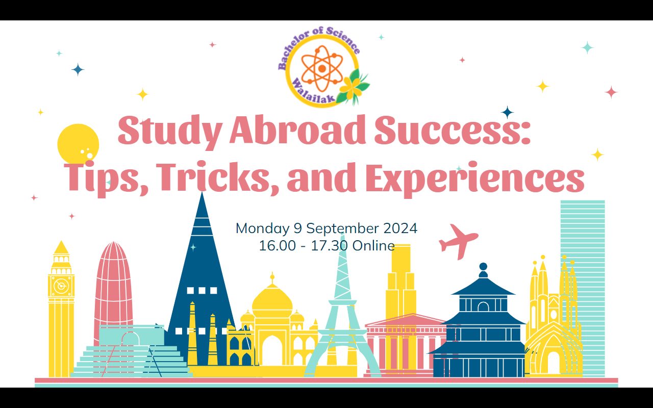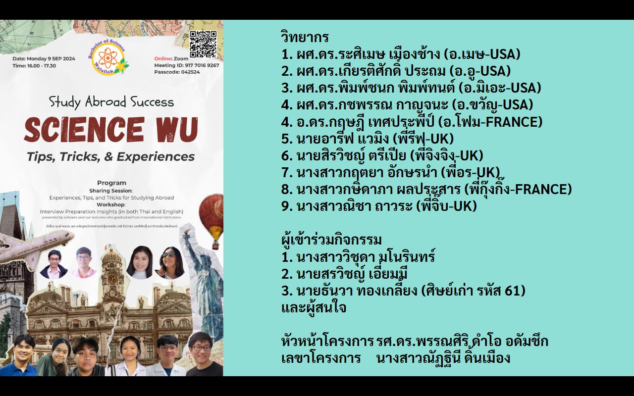 เมื่อวันจันทร์ที่ 9 กันยายน 2567 ที่ผ่านมา หลักสูตรวิทยาศาสตร์ มหาวิทยาลัยวลัยลักษณ์ ได้จัดกิจกรรม แนะแนวการศึกษาต่อต่างประเทศ ผ่านระบบ Zoom เพื่อแบ่งปันประสบการณ์และให้คำแนะนำแก่ นักศึกษาที่ผ่านเข้ารอบสัมภาษณ์ทุน พสวท. ต่างประเทศ รวมถึงผู้สนใจทั่วไป โดยกิจกรรมนี้จัดขึ้นภายใต้การสนับสนุนของ ศูนย์ พสวท. มหาวิทยาลัยวลัยลักษณ์