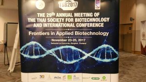 อ.ดร.พักตร์พิมล อึ่งเจริญวิวัฒน์ ได้เข้าร่วมนำเสนอผลงานเรื่อง Transesterification reaction for palm based wax esters by immobilized lipase EQ3 isolated from wastewater of fish canning industry ในงานประชุมวิชาการประจำปีระดับนานาชาติของสมาคมเทคโนโลยีชีวภาพแห่งประเทศไทย ครั้งที่ 29 ประจำปี 2560 ในหัวข้อ “Frontiers in Applied Biotechnology” โดยสมาคมเทคโนโลยีชีวภาพแห่งประเทศไทย (TSB) และสาขาอุตสาหกรรมเกษตร อาหาร และเทคโนโลยีสิ่งแวดล้อม (AFET) คณะวิทยาศาสตร์ประยุกต์ มหาวิทยาลัยเทคโนโลยีพระจอมเกล้าพระนครเหนือ (KMUTNB) วันที่ 23-25 พฤศจิกายน 2560 ณ โรงแรมสวิสโซเทล เลอ คองคอร์ด กรุงเทพฯ